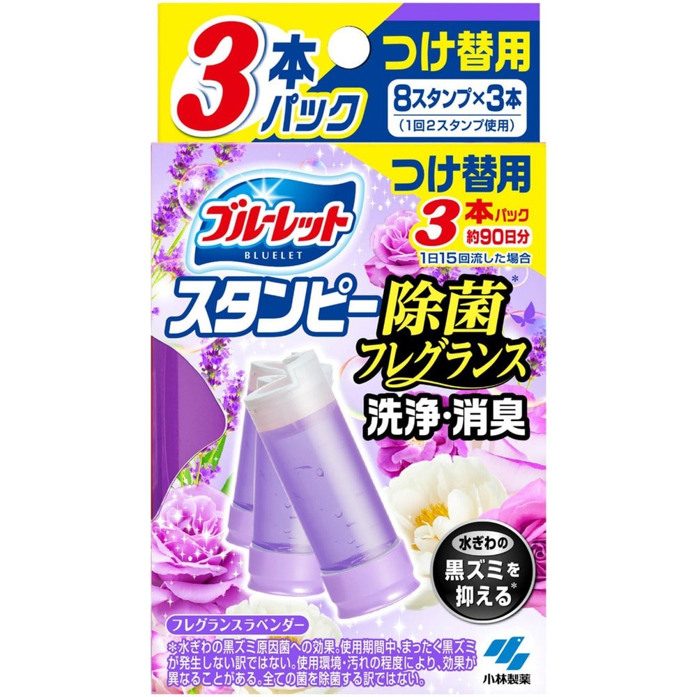 KOBAYASHI Bluelet Stampy Lavender — это запасной блок дезодорирующего очистителя для унитаза в виде гелевого цветка с ароматом лаванды. В упаковке содержится три сменных гелевых картриджа по 28 г, предназначенных для использования с оригинальным аппликатором Bluelet Stampy.