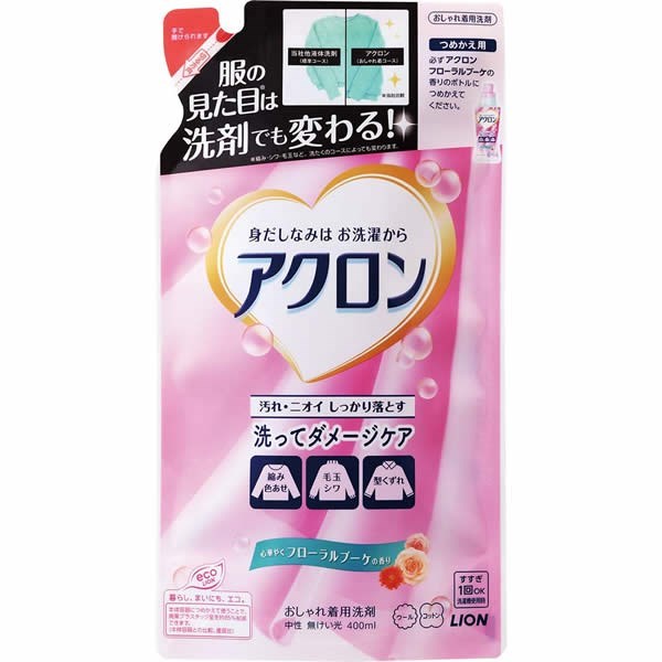 Средство для стирки деликатных тканей Lion Acron не содержит фосфатов, не содержит флюоресцентного отбеливателя, предотвращает усадку, не растягивает одежду при стирке, предотвращает образование катышков и выцветание одежды. В Японии этим средством стирают даже вещи которым рекомендована химическая чистка! Содержит активный компонент Nonion, поверхностно-активное вещество, которое быстро проникает в ткани, чтобы удалить даже самые сложные загрязнения и пятна. Акрон также полностью удаляет частички кожного сала и пота, и сертифицированы как безопасные средства при стирке одежды со значками Woolmark и Cotton USA (которыми помечаются только изделия высочайшего качества, изготовленные из шерсти или хлопка, соответственно).