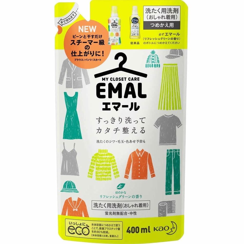 Средство для стирки KAO "EMAL" Refresh Green (400мл) с ароматом зеленых цитрусов применяется для стирки изделий из шерсти, шёлка и деликатных тканей.