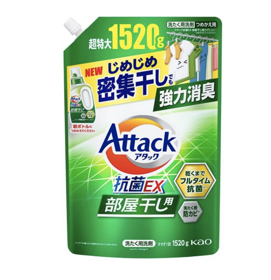 434388 KAO Attack Antibacterial EX Жидкое средство для стирки, для сушки белья в помещении, с антибактериальным эффектом и ароматом свежей зелени, м/у 1520г